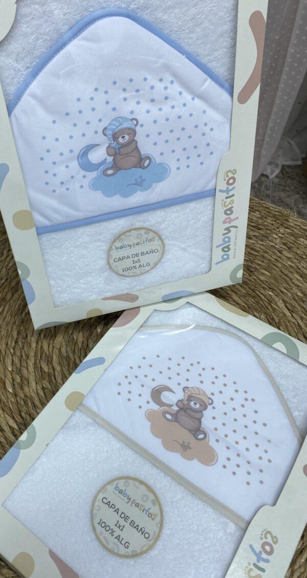 Capa de baño de un metro por un metro con detalle estamapado en el gorro. 100% algodón, de tacto suave.