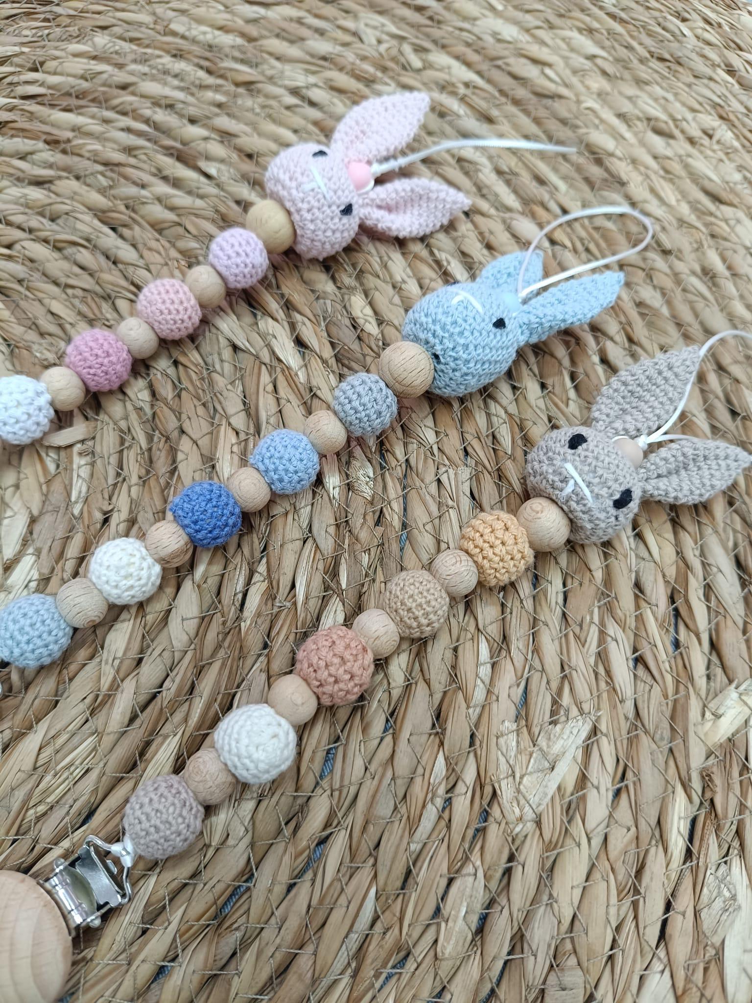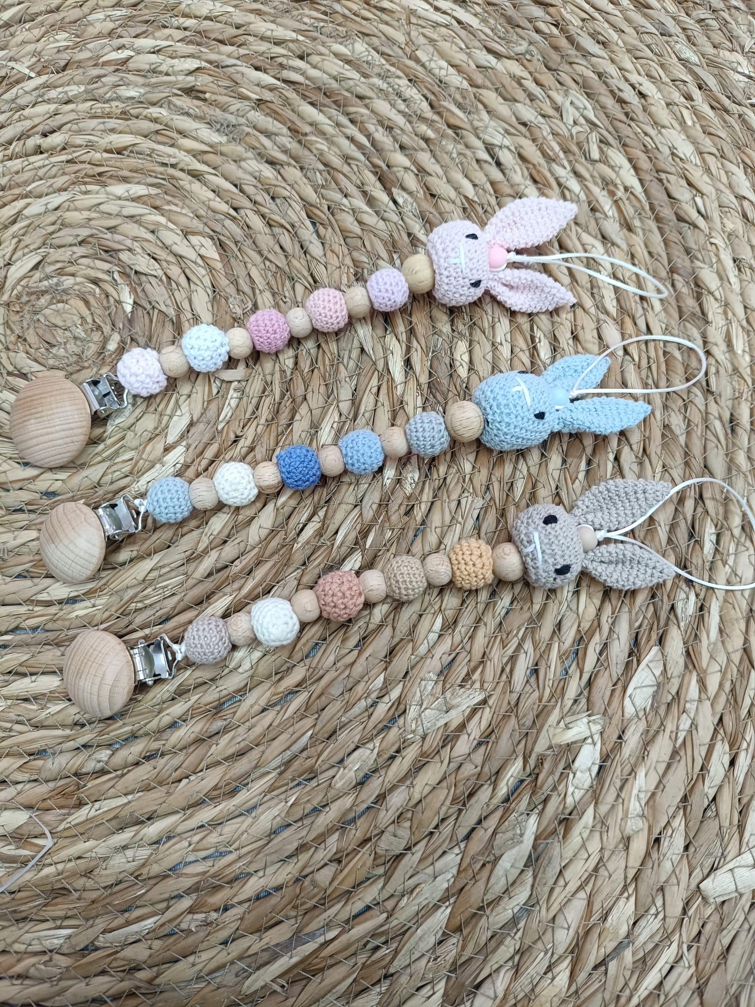 Chupetero de crochet con cabecita de conejito. Hecho totalmente a mano.