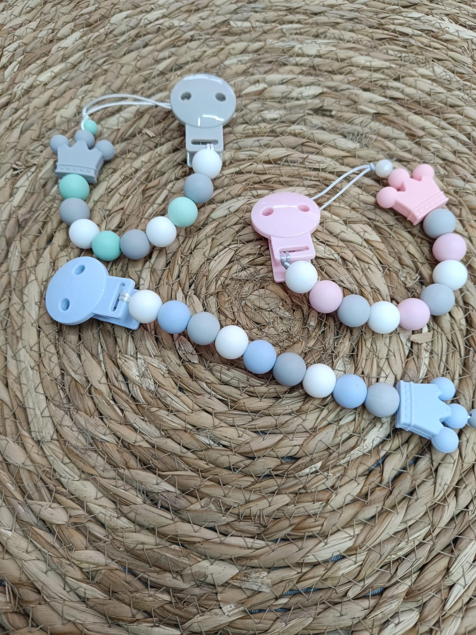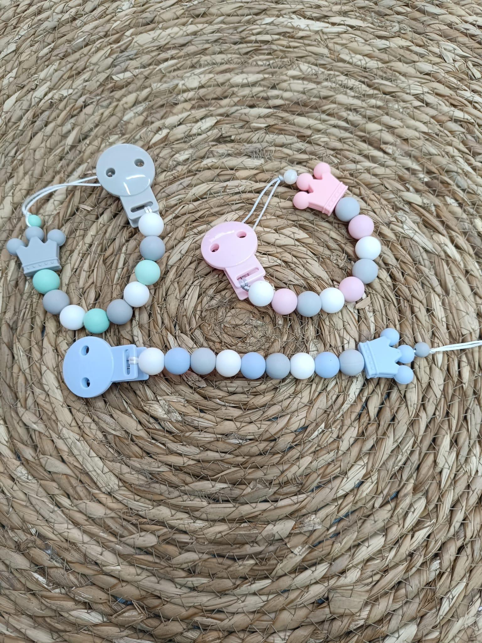 Chupetero tricolor con broche de pinza, no pesa. Hecho a mano con cariño y mimo con cuentas de silicona alimenticia libre de BPA. También se puede añadir el nombre del bebé al finalizar el pedido en NOTAS.