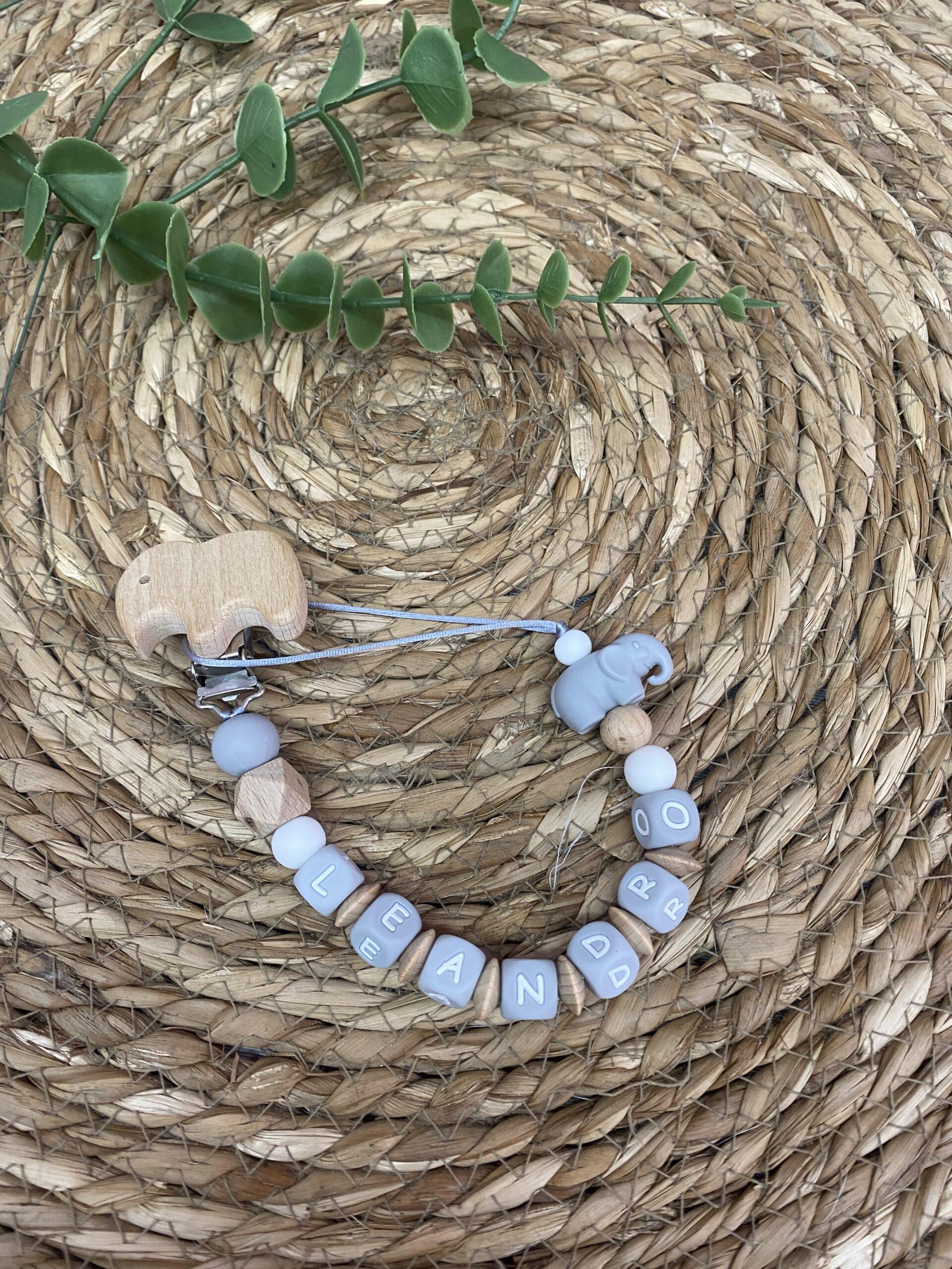 Chupetero combinado en madera y silicona alimenticia. Contraste en letras grises. Hecho a mano con mucho amor con materiales respetuosos. AÑADIR NOMBRE BEBÉ EN NOTAS AL FINALIZAR PEDIDO
