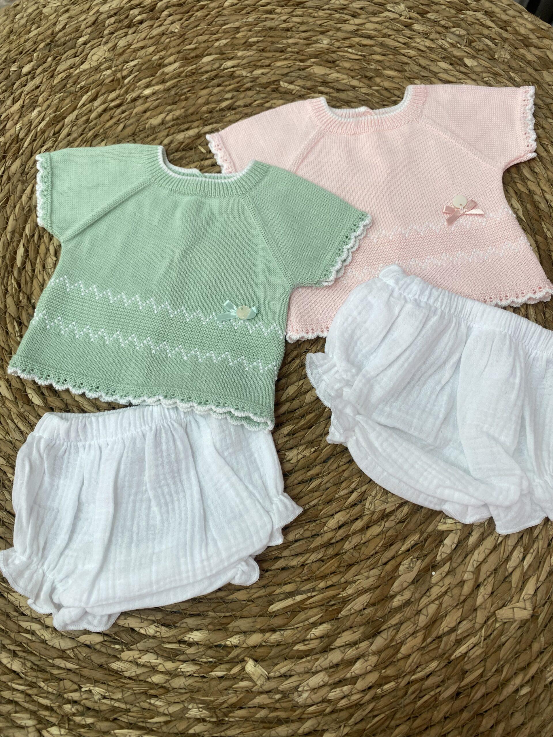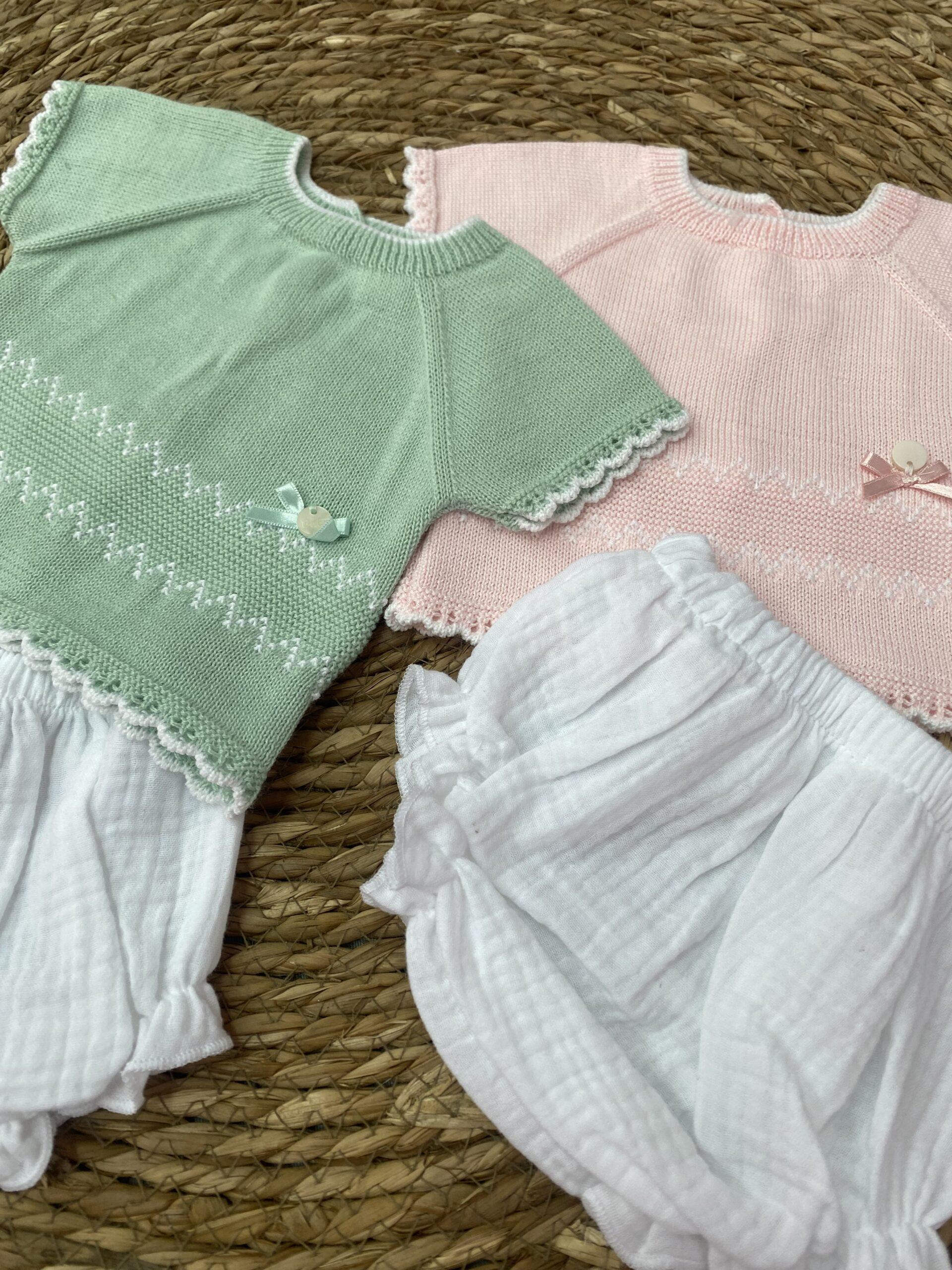Conjunto de dos piezas compuesto por culetín de bambula y camiseta en perlé.