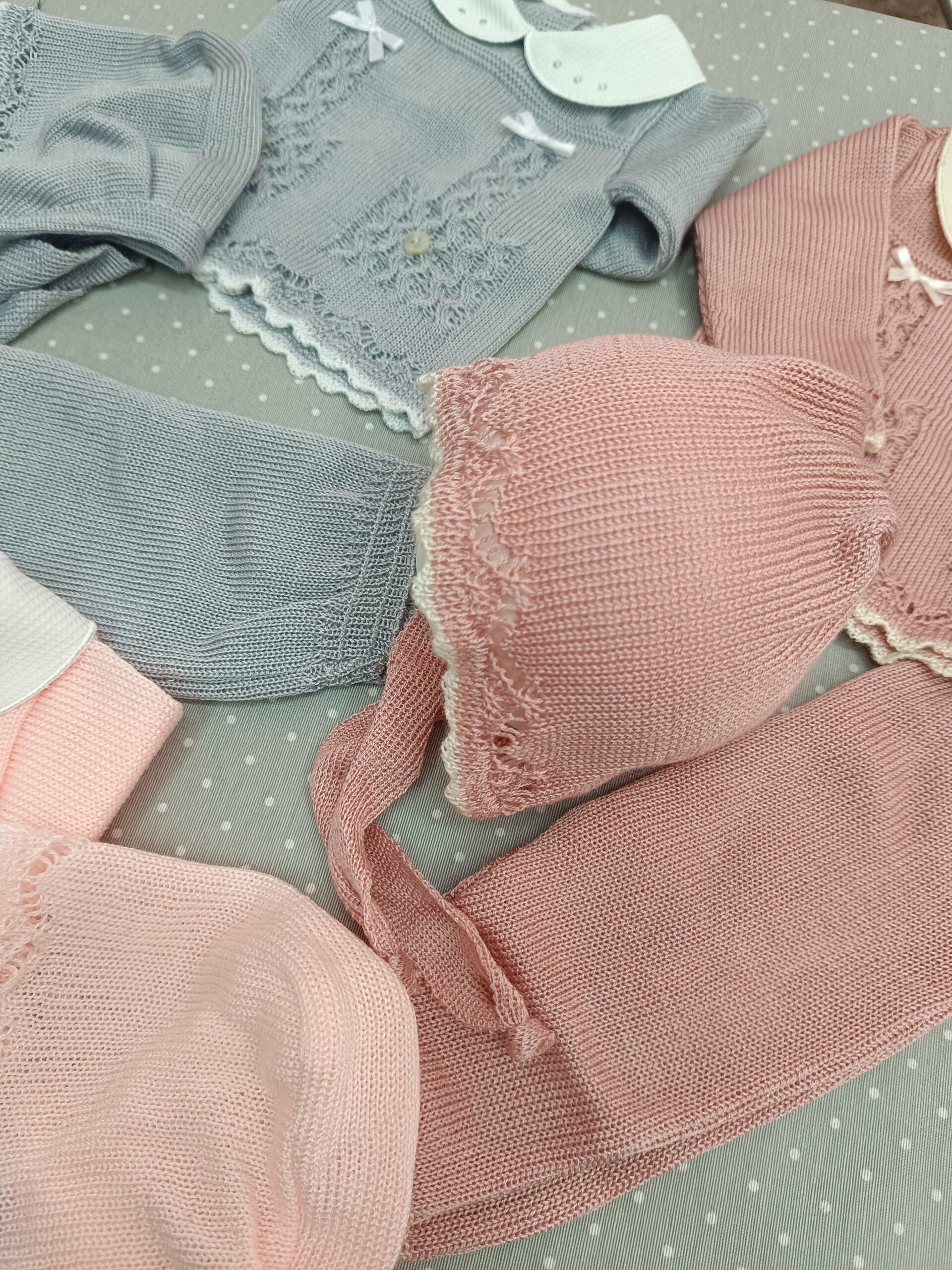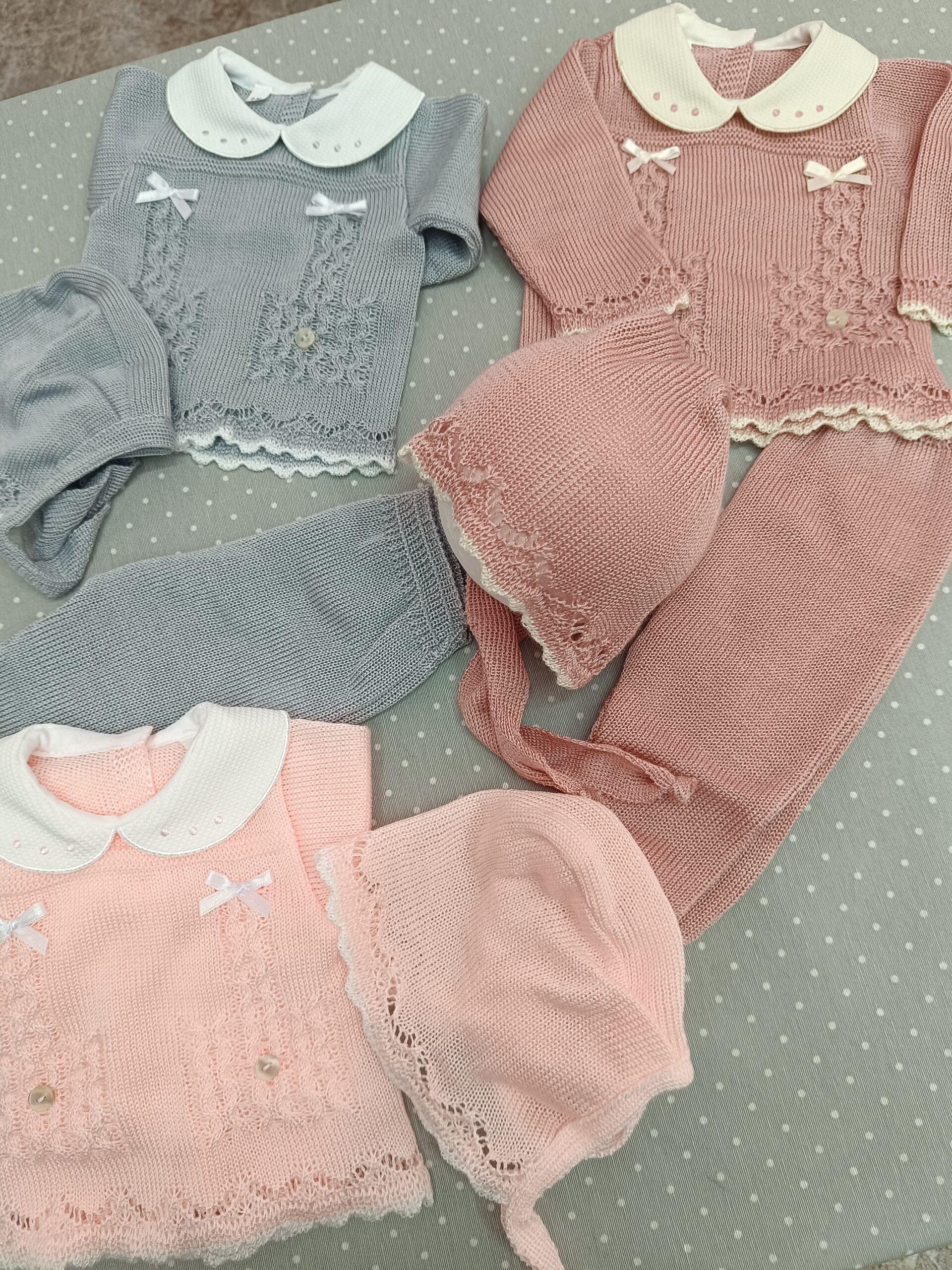 Bonito conjunto de primera puesta de hilo compuesto por capota, polaina y jersey. Ideal para primavera