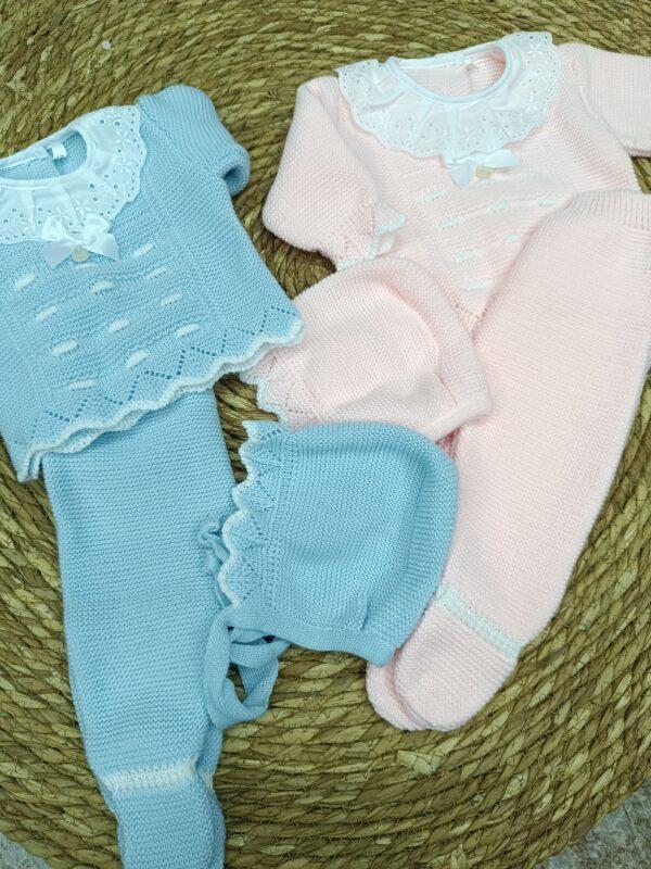 Conjunto de lana en talla de 0-3meses, compuesto por tres piezas. Detalle de maxicuello