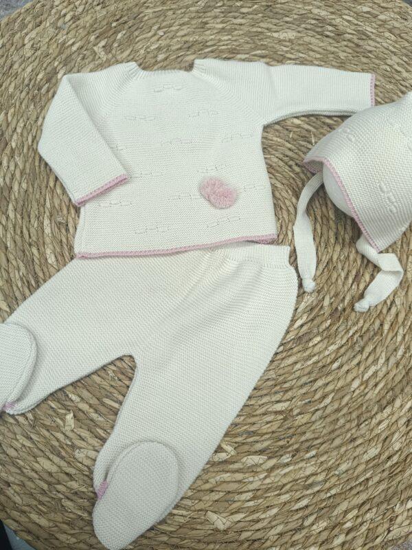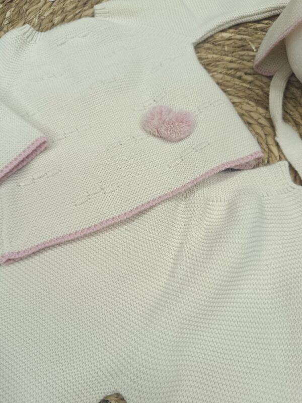 Bonito conjunto de lana en color beige con detalles en rosa. Talla única de 0-3 meses.
