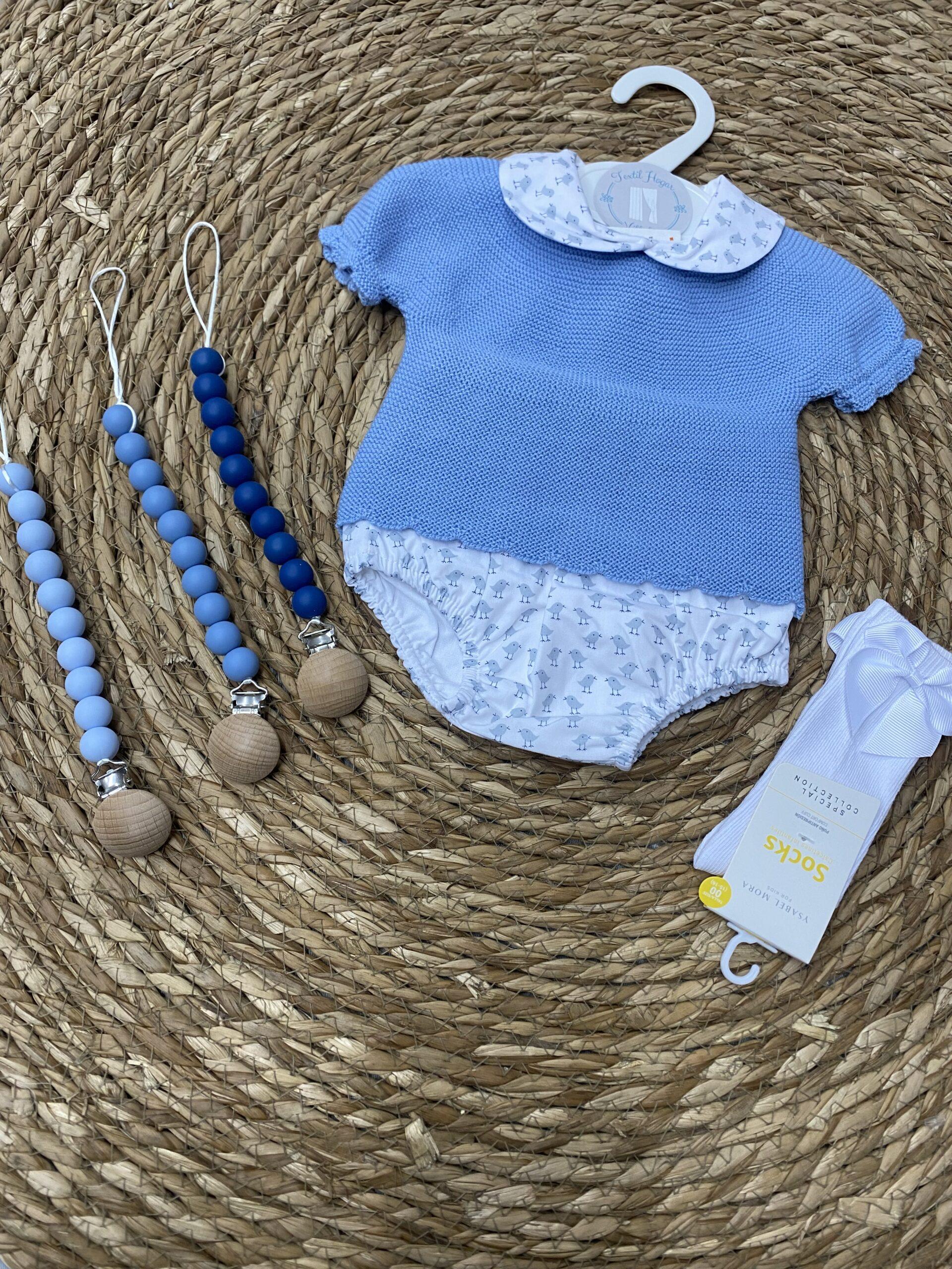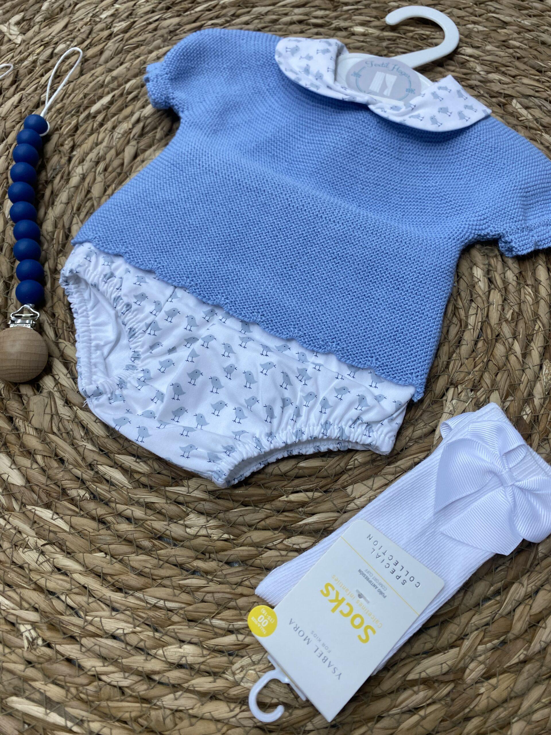 Conjunto de hilo de dos piezas, culetin de algodón y camisa de hilo con cuellos a juego. No incluye calcetines o chupeteros