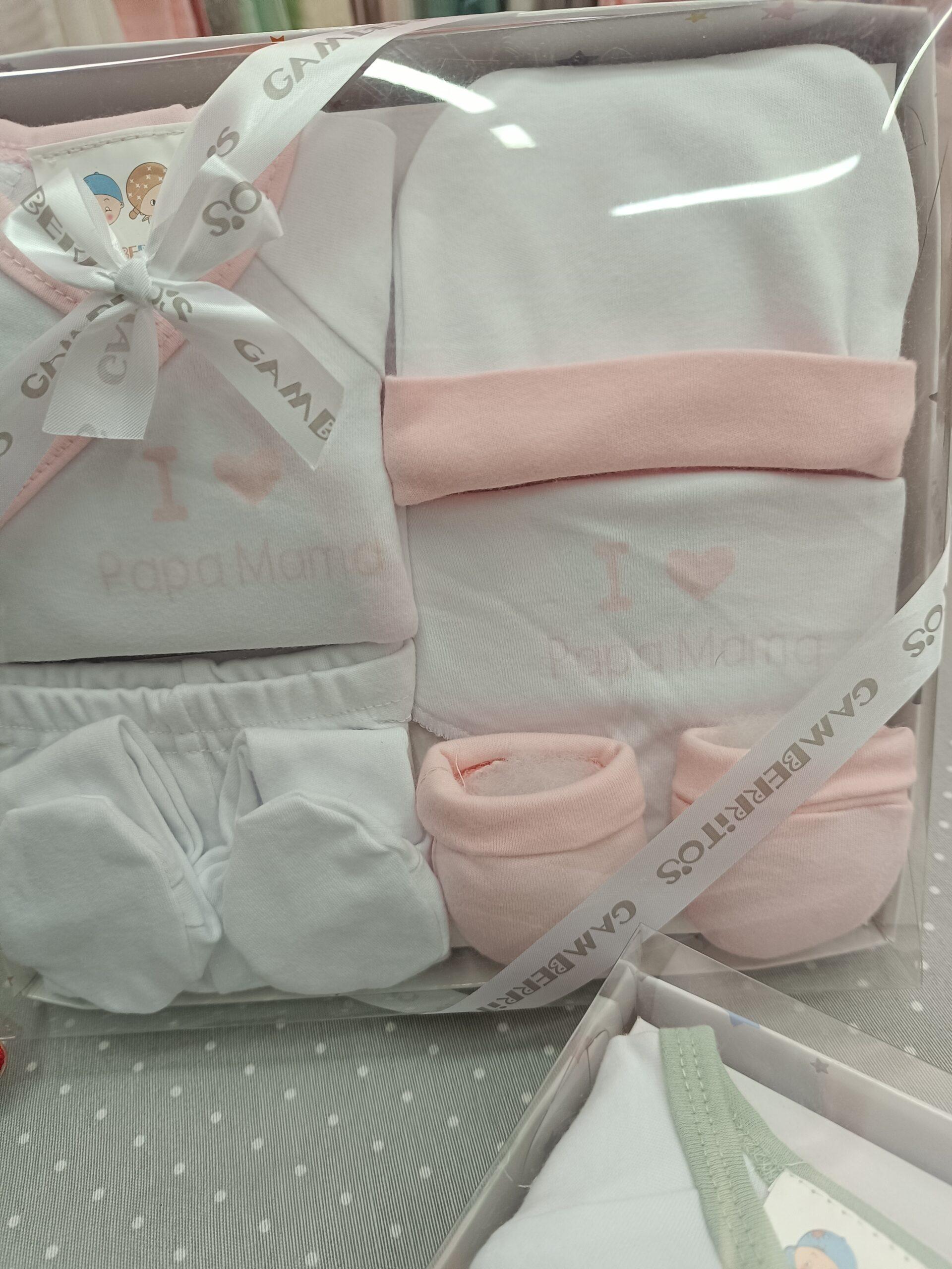 Pack de hospital en color rosa, 100% algodón. Compuesto por polaina, camiseta,gorrito,babero y manoplas.
