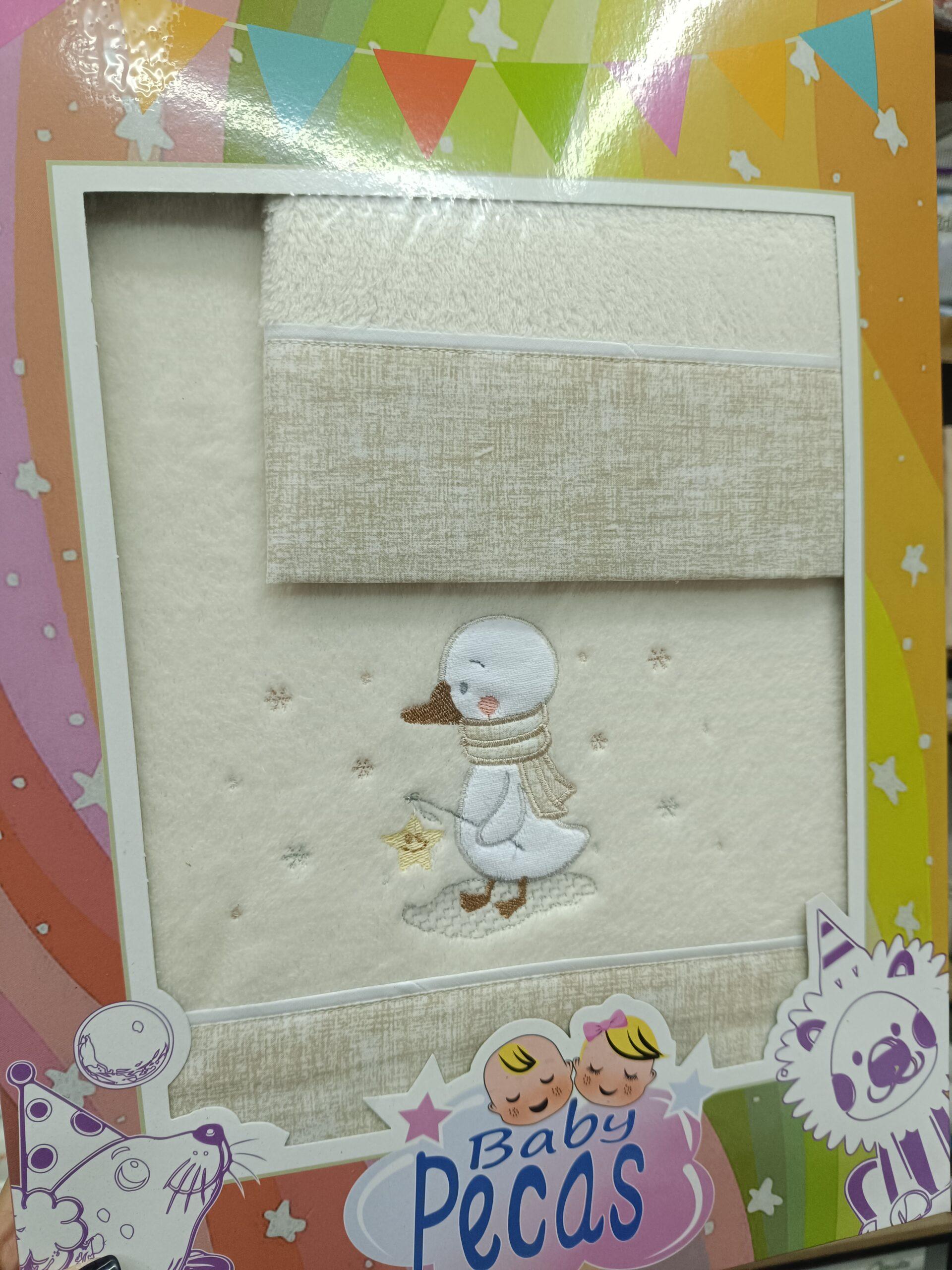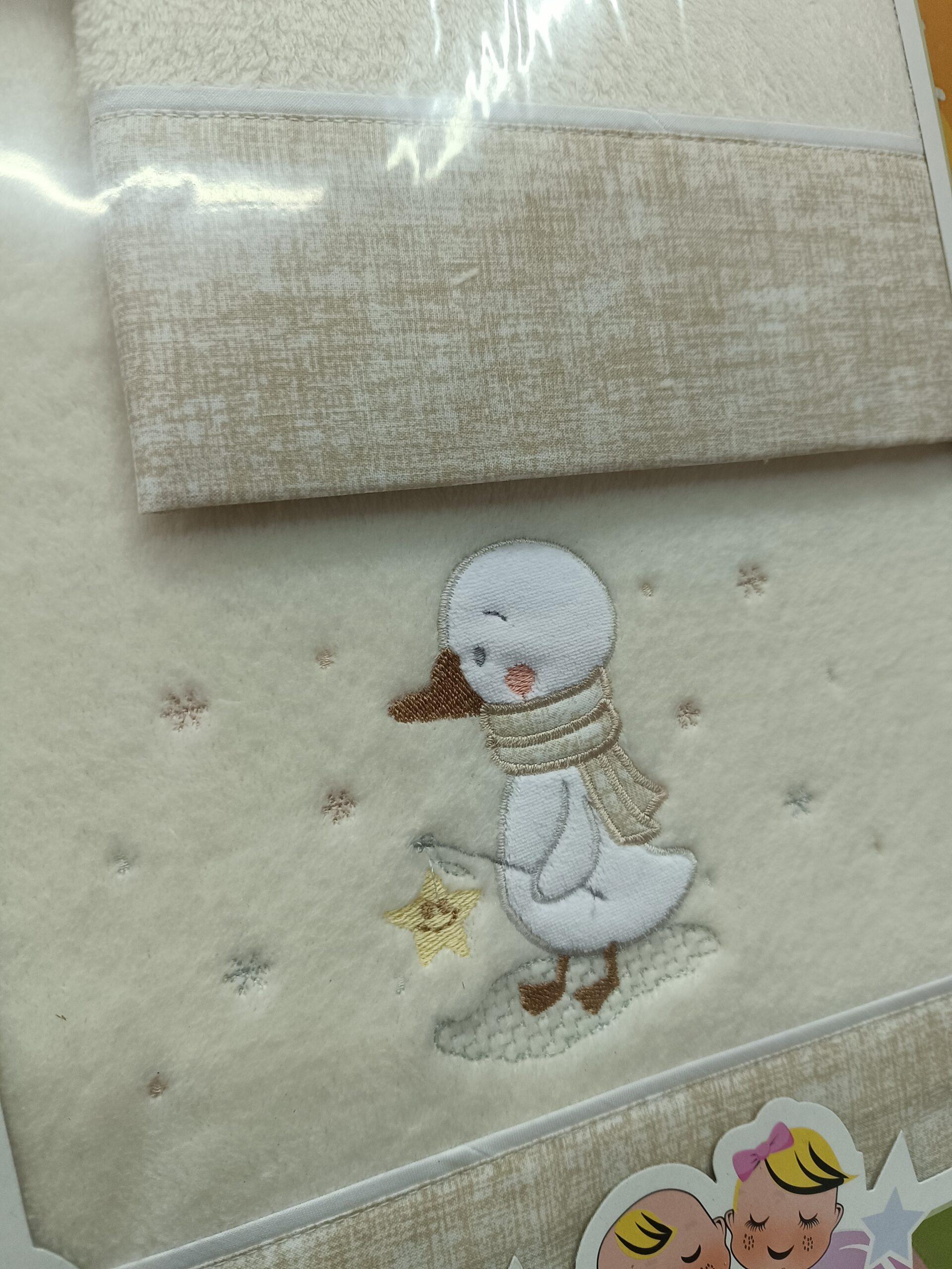 Sabana de cuna de coralina con patito en beige. suave y agradable. De coralina,100% poliéster. Compuesta por bajera,encimera y funda de almohada.