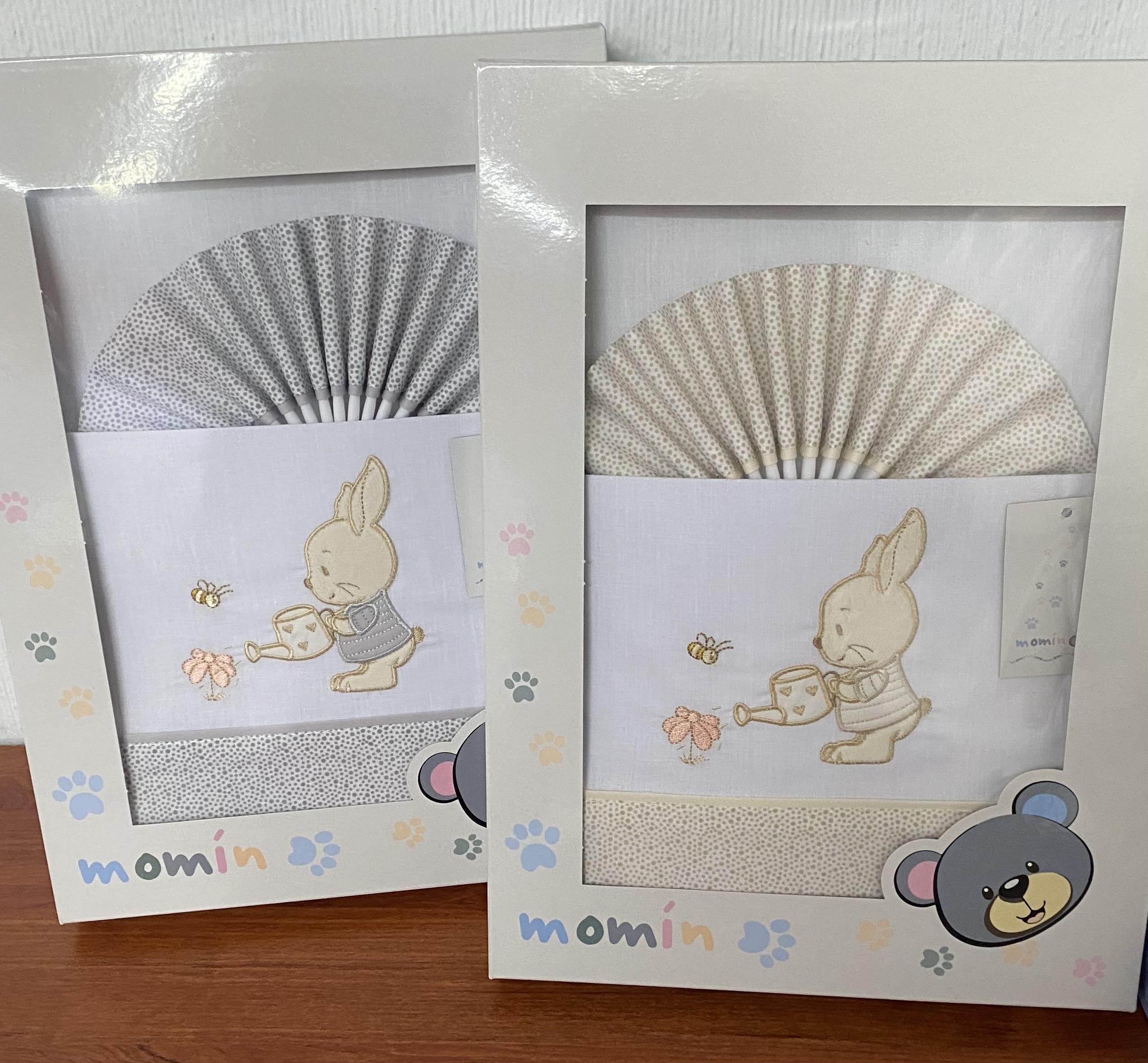 Juego de sabana para minicuna. Mide 50x80cm ideal para la primavera- verano. 100% algodón. Compuesta por bajera, encimera y funda de almohada.