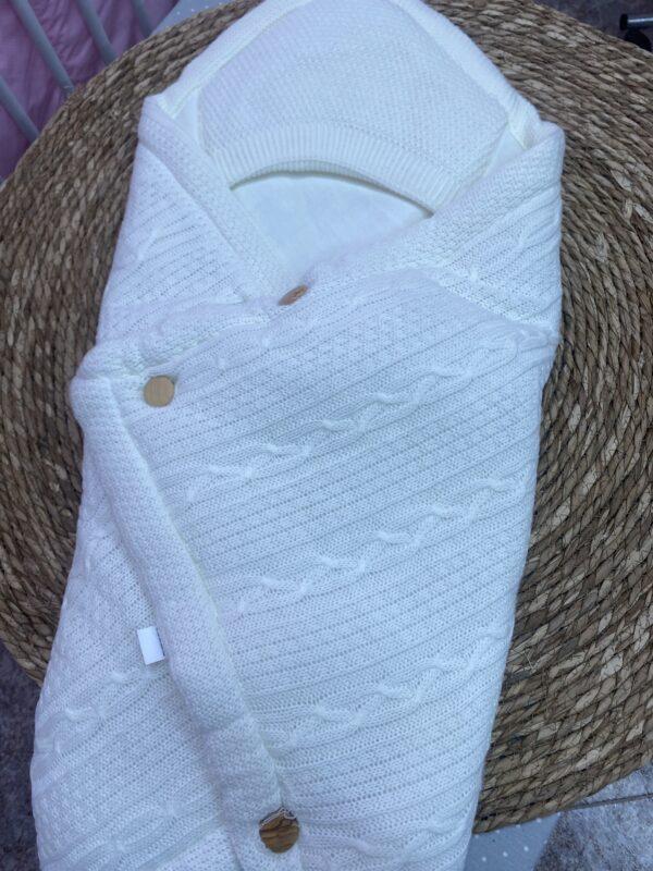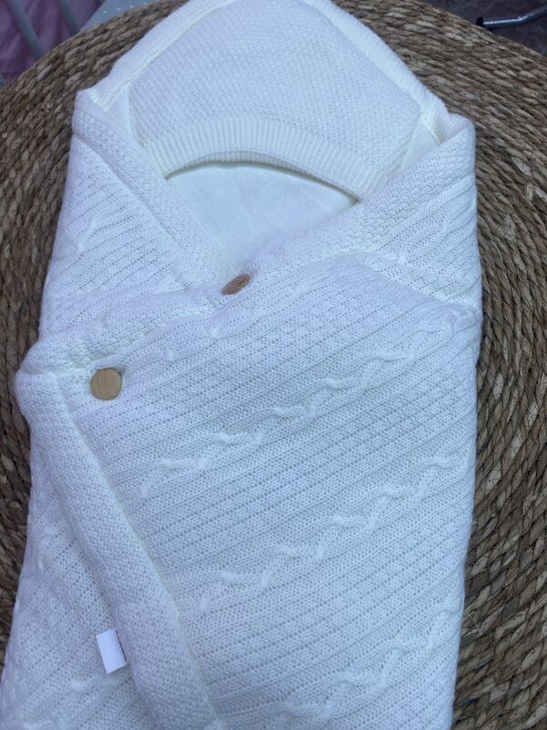 Saco de lana ideal para carro o para minicuna, de corte cruzado, abotonado con botones imitación madera. Perfecta para las bajas temperaturas del invierno.